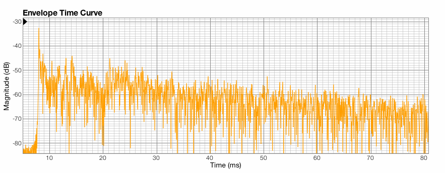 As you can see in the graph above, the decay times are much faster and much more uniform versus frequency after adding bass traps (and in this case diffusors) to the room. Envelope Time Curve (NM) The measurement below shows sound pressure level on the vertical axis and time on the horizontal axis. The graph is sometimes normalized so that the direct sound received from the loudspeaker is set to 0 decibels (dB) and 0 millisecond (ms). This chart, taken from FuzzMeasure, has not been normalized. From this graph you can see the level and time of reflections from room boundaries and other objects within the listening room. The target for this measurement is typically that the level of reflections should be at least 10 to 15 dB softer than the direct sound. Let's pretend there is a strong reflection at 10ms after the direct sound - the left-most peak at 8 ms on the chart below. To find where this is coming from in a room you will need to convert time into distance. The speed of sound is 1,125 feet per second (i.e. the sound from your speakers travels 1,125ft in one second). That equates to approximately 1.1 feet per thousandth of a second (i.e. 1.1 feet per ms). So in 10 ms the sound has traveled 11ft. You should then look around your room to identify the boundaries or objects that are causing the reflection. Remember that the sound has to travel to and from a boundary before it reaches the microphone position. Once you find the boundary in question then you can determine if that reflection is problematic and should be treated. Some reflections are not necessarily problematic (e.g. side walls away from reflection points), and there are different options on how to treat the reflection (it can be absorbed or diffused or reflected away). |